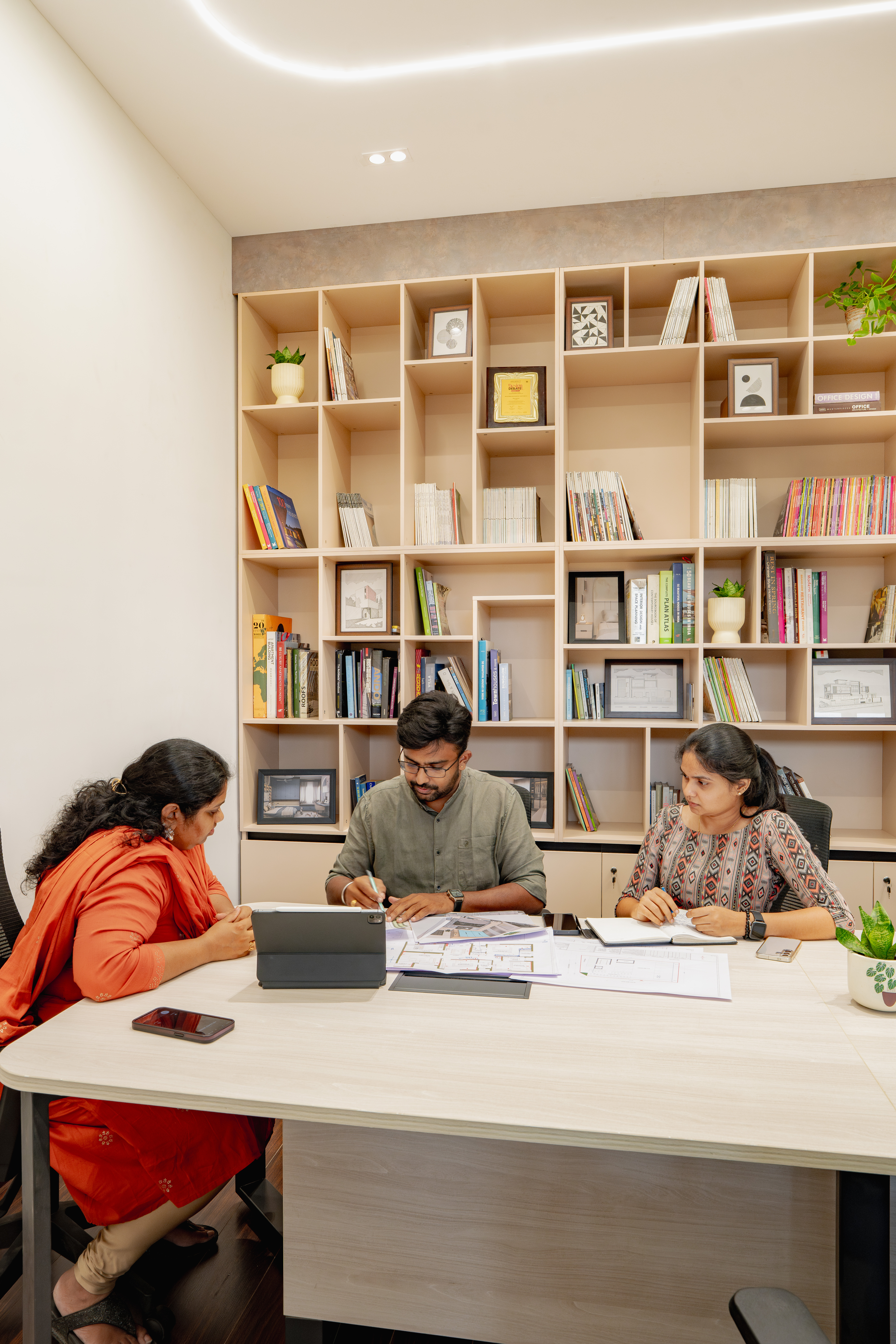 The Vesta Architects office is a 3,000 sq.ft contemporary workspace thoughtfully planned to reflect the studio’s design philosophy and work culture. The layout accommodates a welcoming reception area, open-plan workstations, meeting and discussion zones, material display areas, and support spaces. Each zone is carefully organized to ensure smooth workflow, visual connectivity, and efficient day-to-day functioning, while maintaining a calm and professional atmosphere.