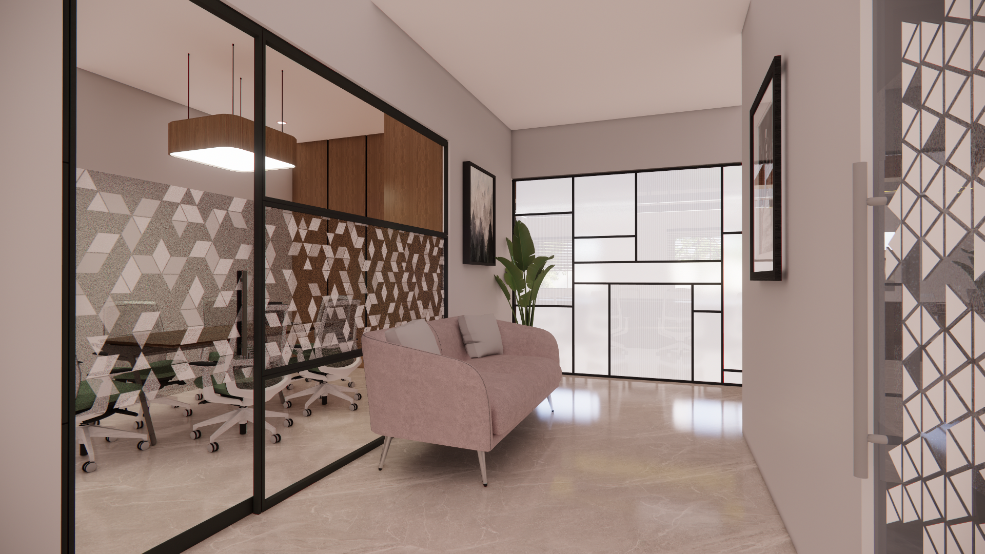 The board room is designed for the well-known industrial chain Sri Ranganathar Industries, located at Thadagam Road, Edayarpalayam, Coimbatore.This space is conceived as an additional extension developed above the second floor, specifically intended to host foreign clients and conduct high-level meetings. The design reflects professionalism and sophistication, creating a refined environment suitable for international business interactions