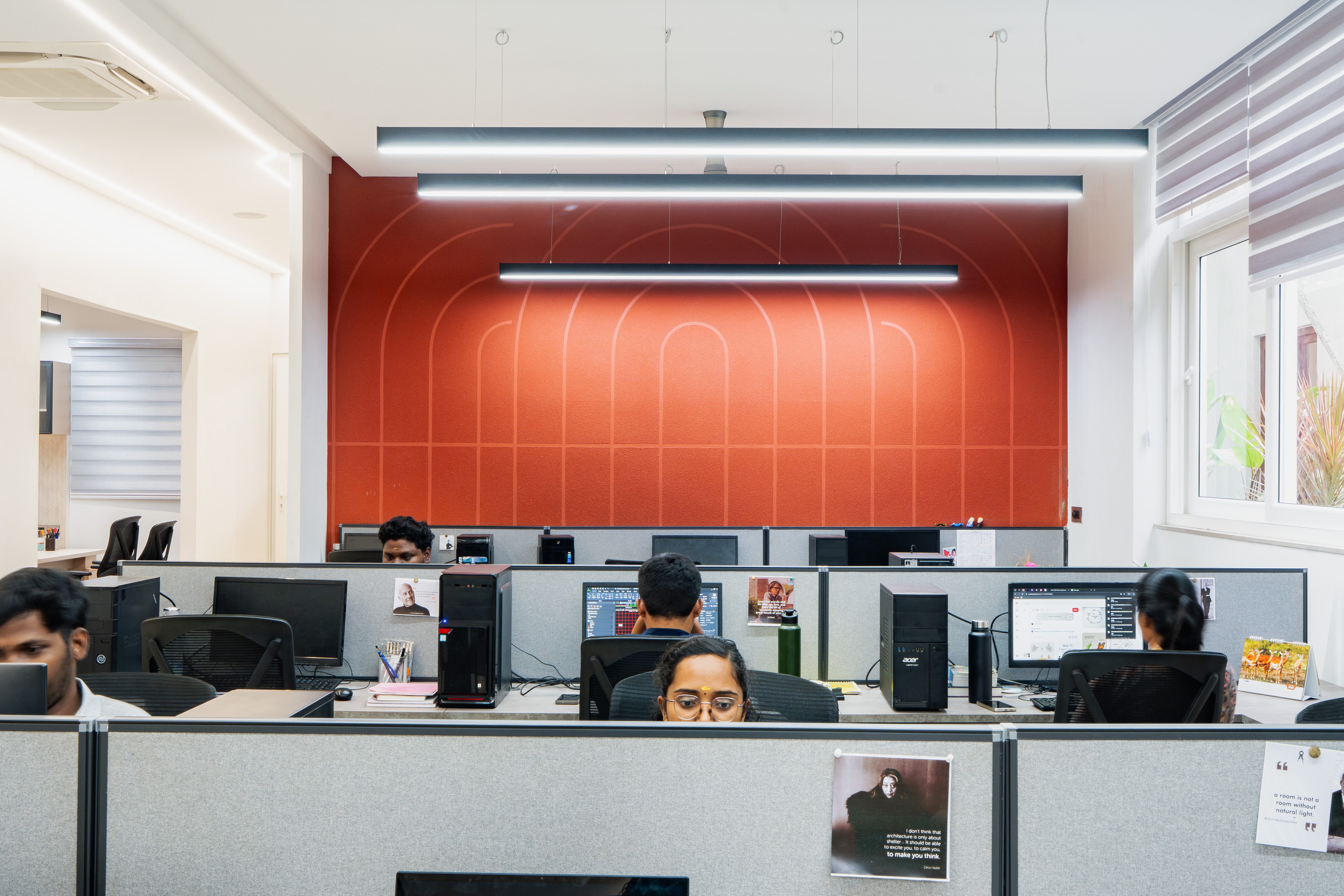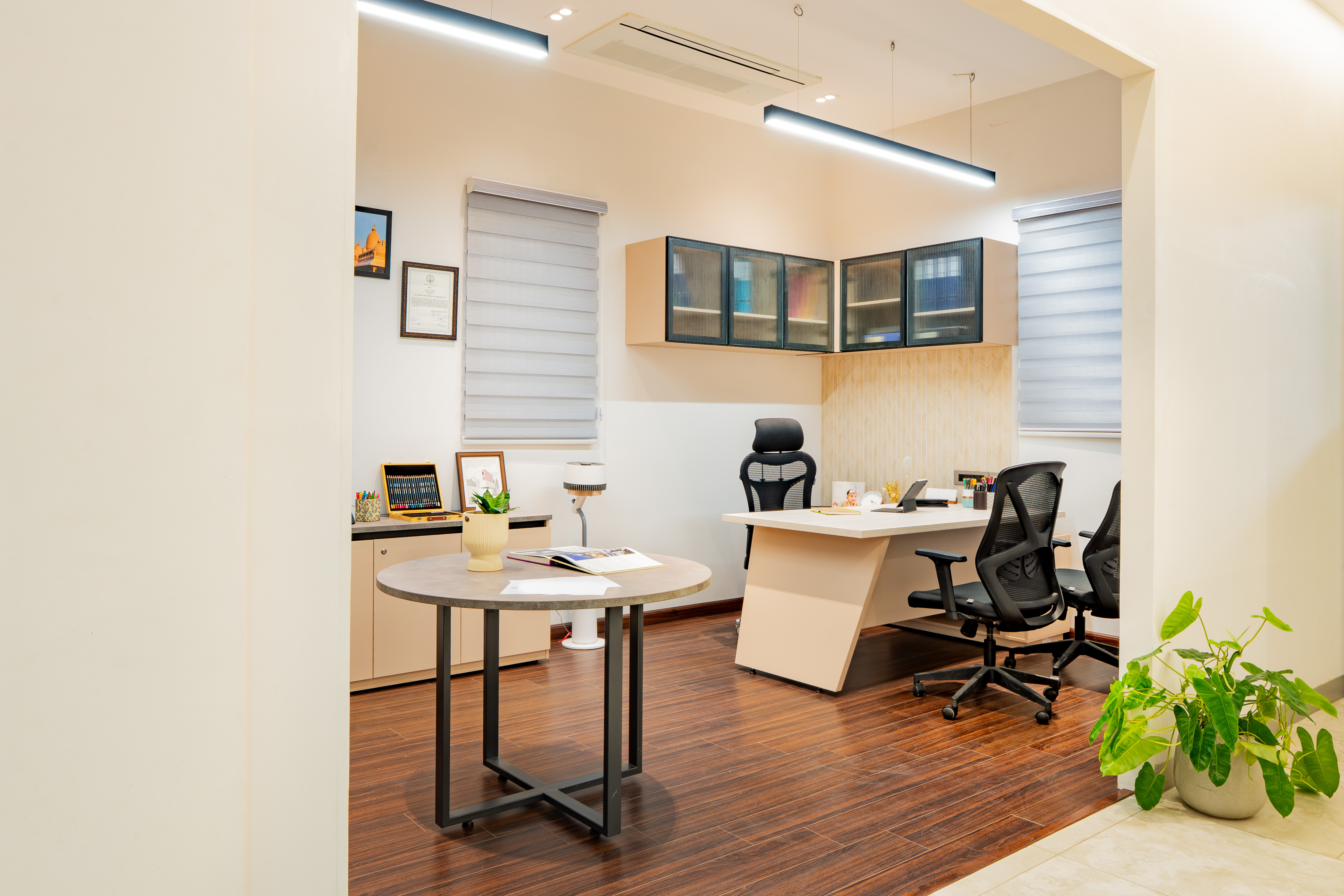 The Vesta Architects office is a 3,000 sq.ft contemporary workspace thoughtfully planned to reflect the studio’s design philosophy and work culture. The layout accommodates a welcoming reception area, open-plan workstations, meeting and discussion zones, material display areas, and support spaces. Each zone is carefully organized to ensure smooth workflow, visual connectivity, and efficient day-to-day functioning, while maintaining a calm and professional atmosphere.