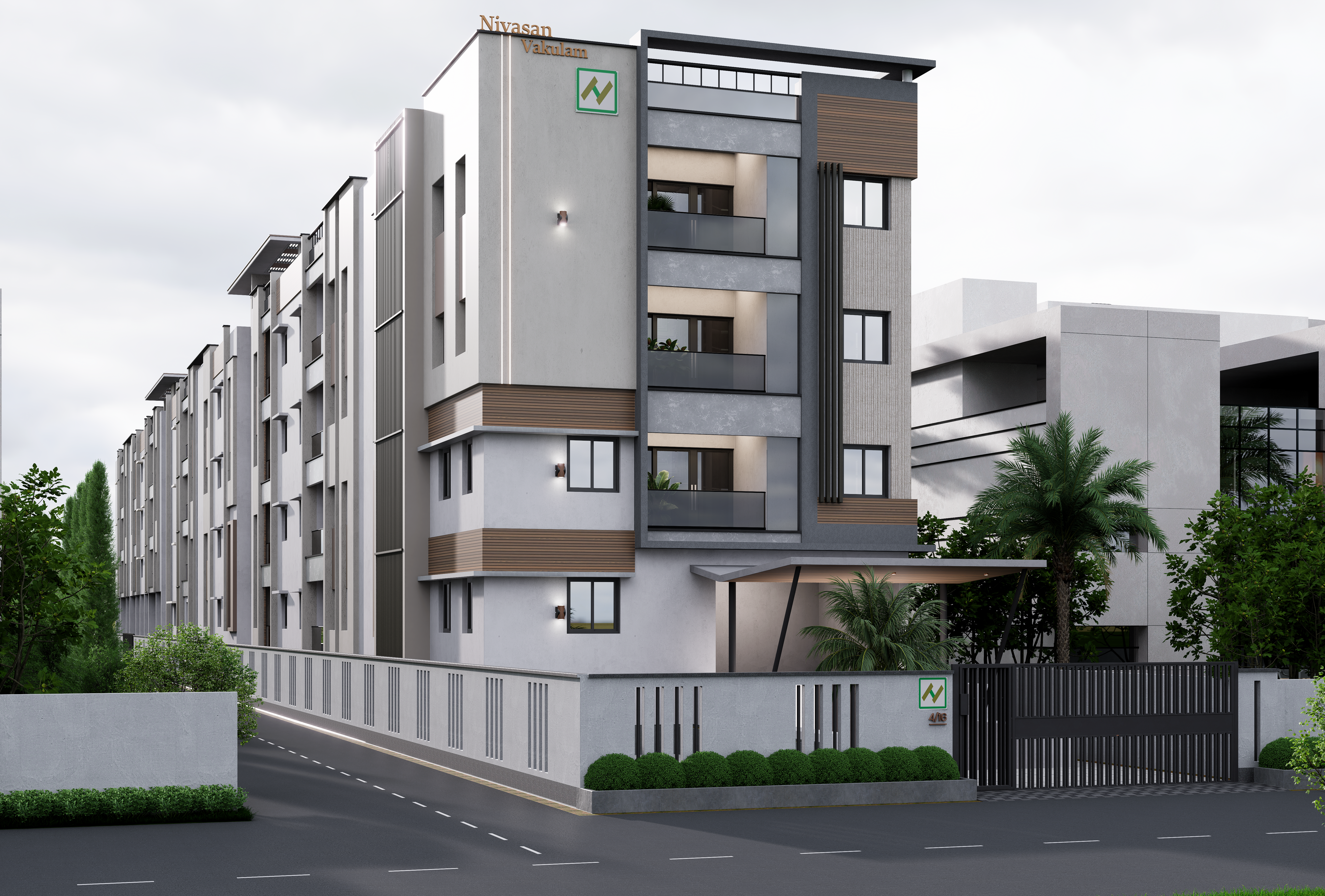Nivasan Vakulam is a residential apartment project developed for Nivasan Homes, located near Tidel Park. The building consists of semi-basement parking, a ground floor, and three residential floors, with a total built-up area of approximately 55,002 sq.ft. The project is planned to accommodate urban residential needs through clear layouts, efficient circulation, and well-defined building massing.